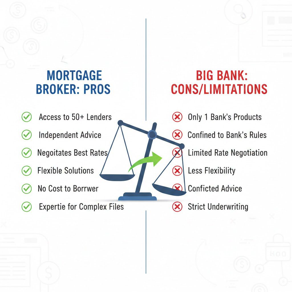 Choice: Banks offer only their own products, whereas brokers access dozens of lenders across Ontario.